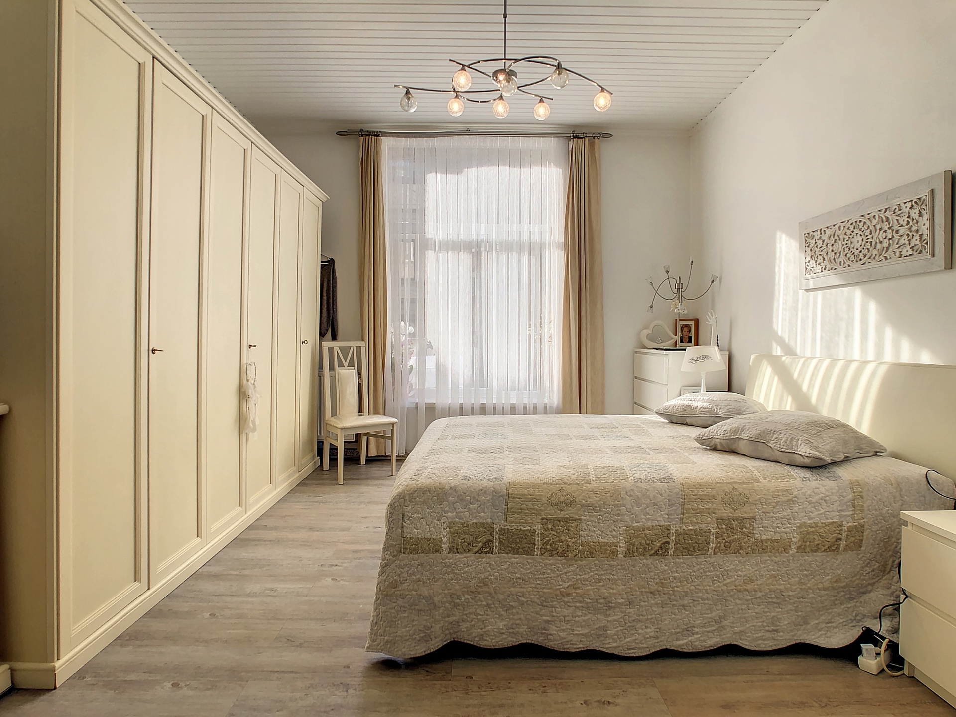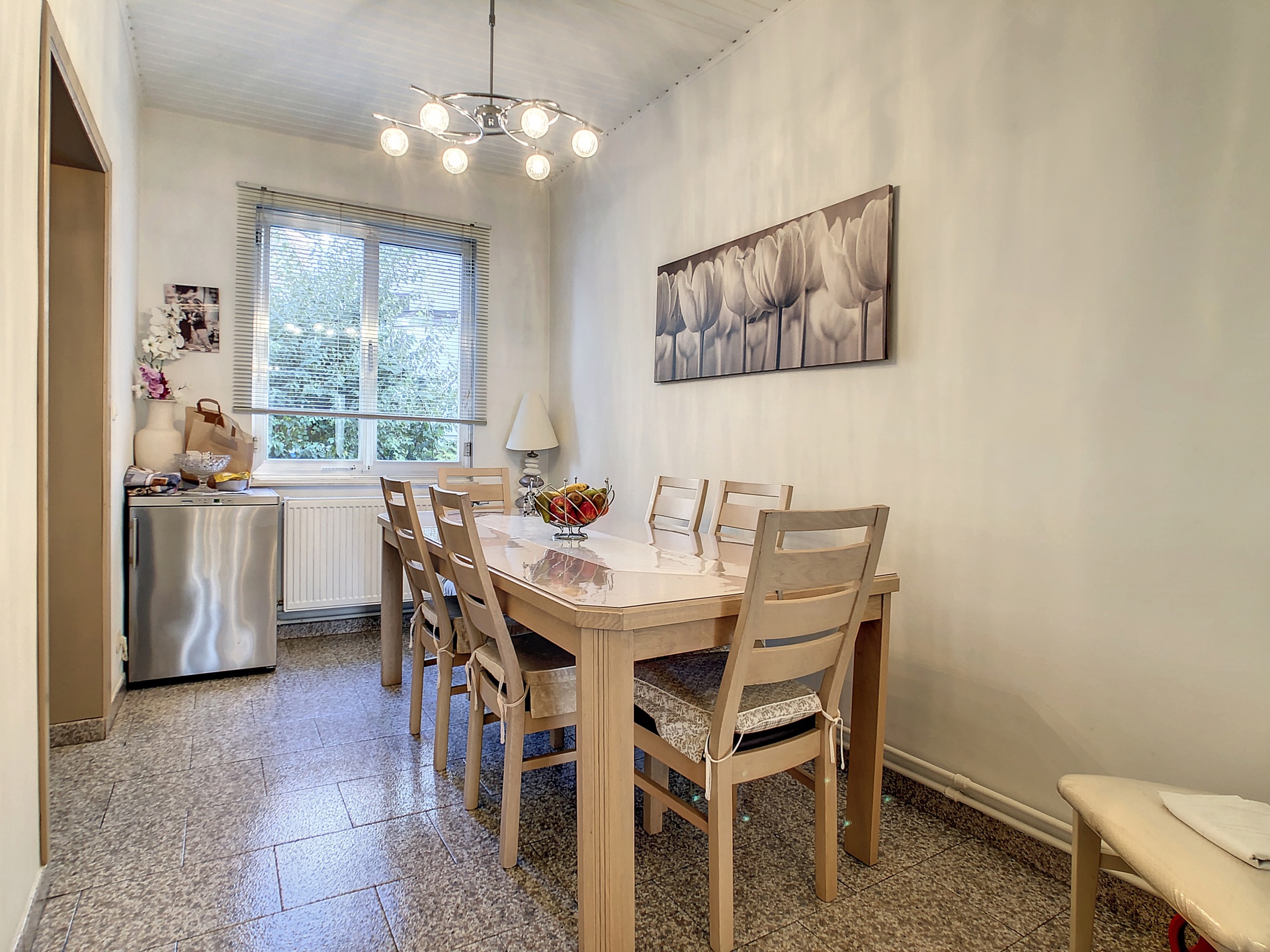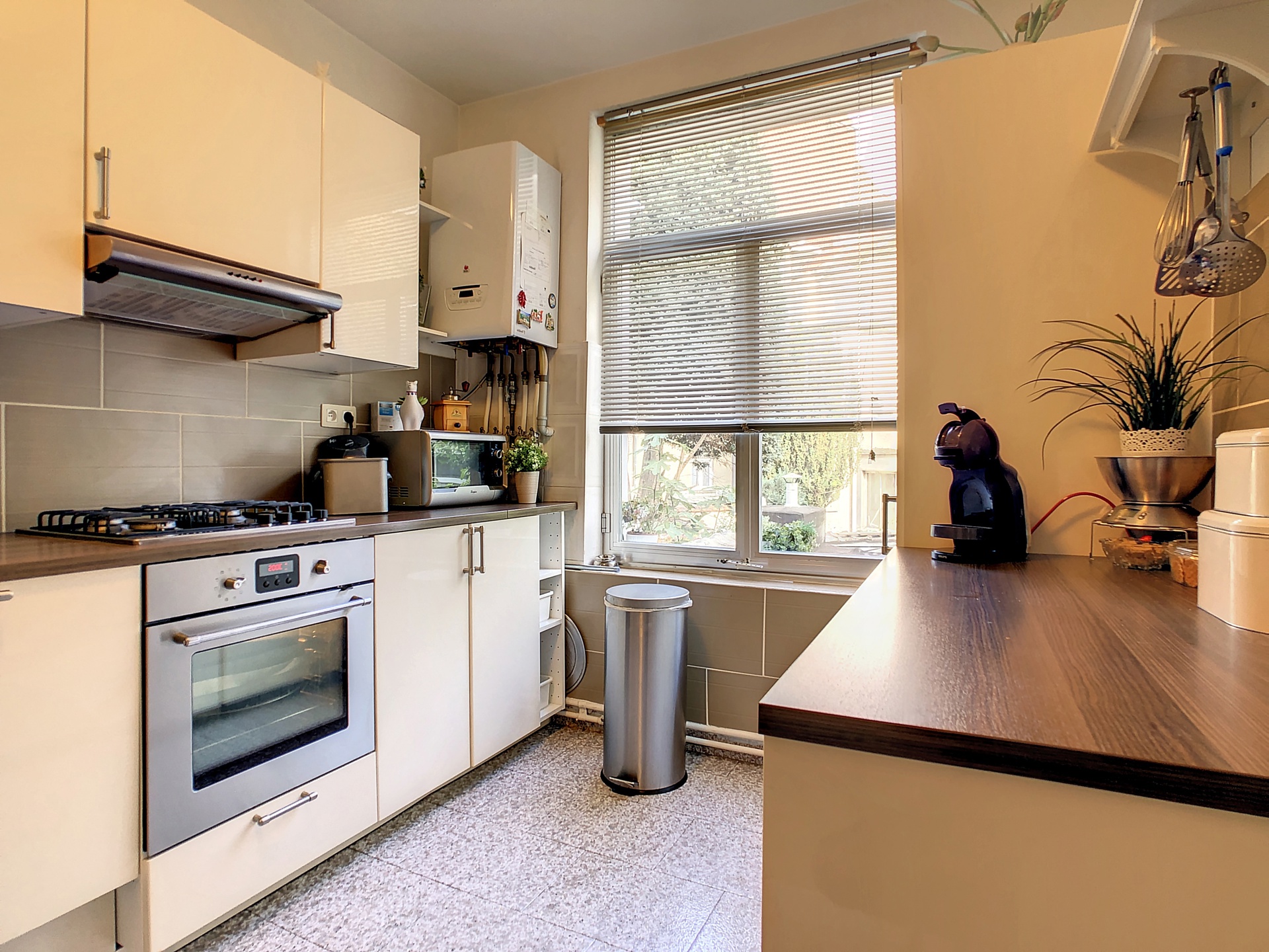 Situé au rez-de-chaussée, vous trouverez cet appartement 1 chambre de +-60m2 composé de: une chambre de +-18m2, un salon/salle à manger de +-25m2, une cuisine super équipée de +-8,5m2, une salle de bain de +-5m2.