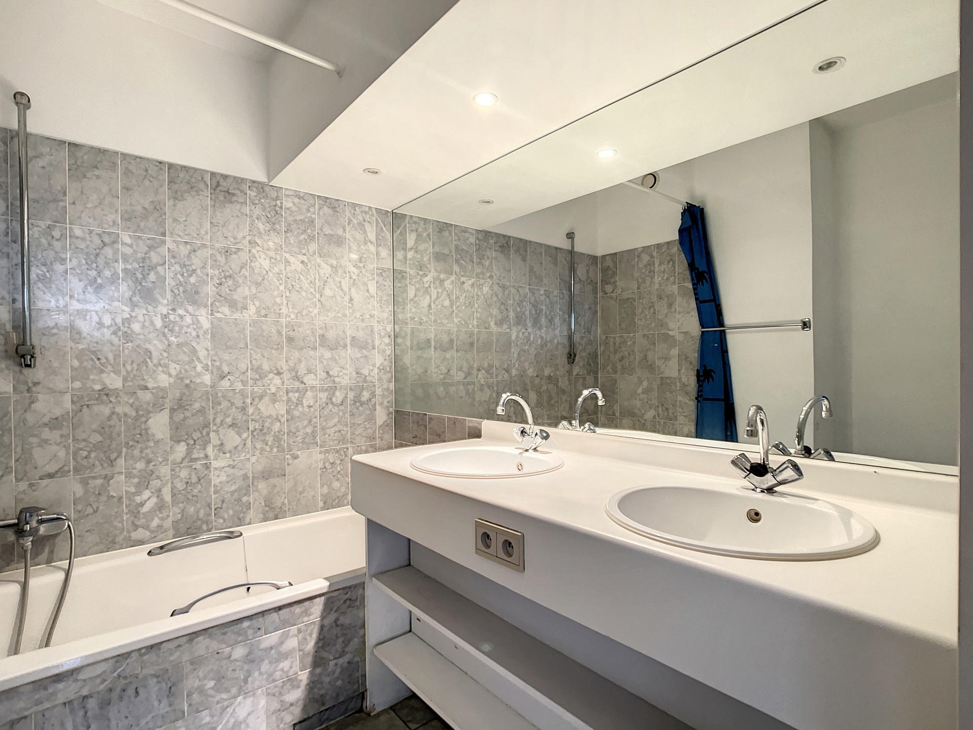 Celui-ci se compose de : un hall d'entrée de +-4m2, un salon lumineux de +-26m2 donnant directement sur la terrasse de +-7,5m2 orientée OUEST.