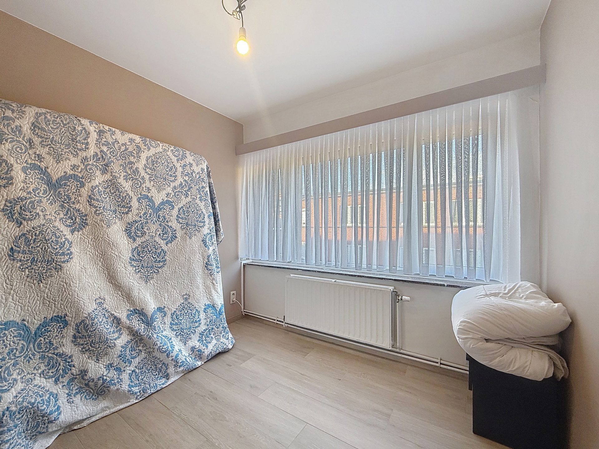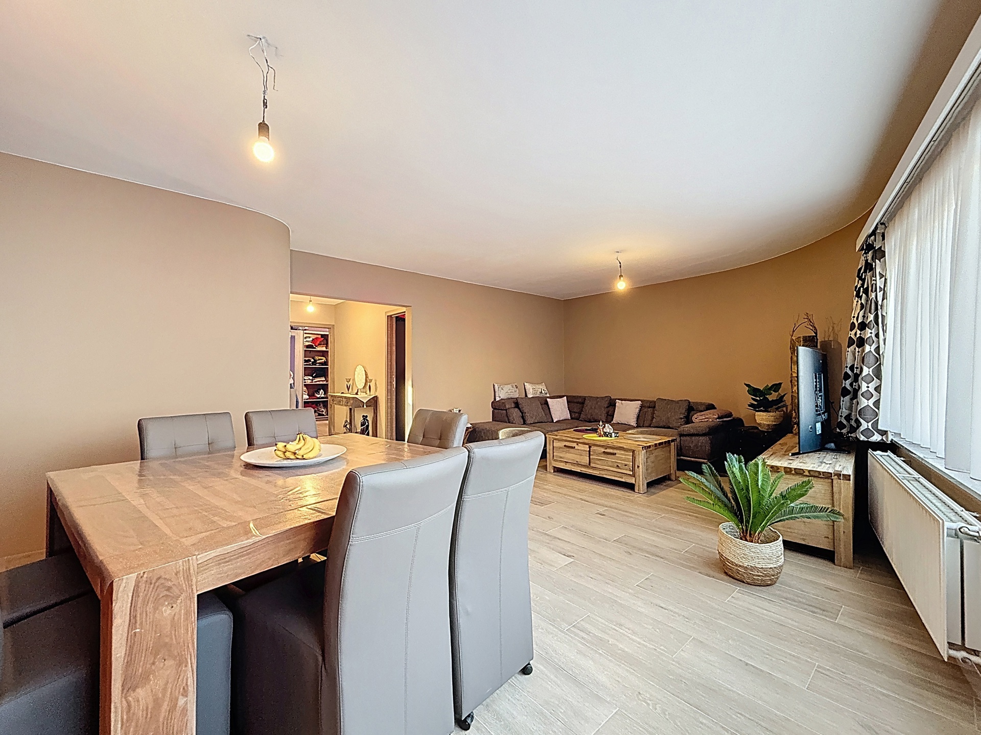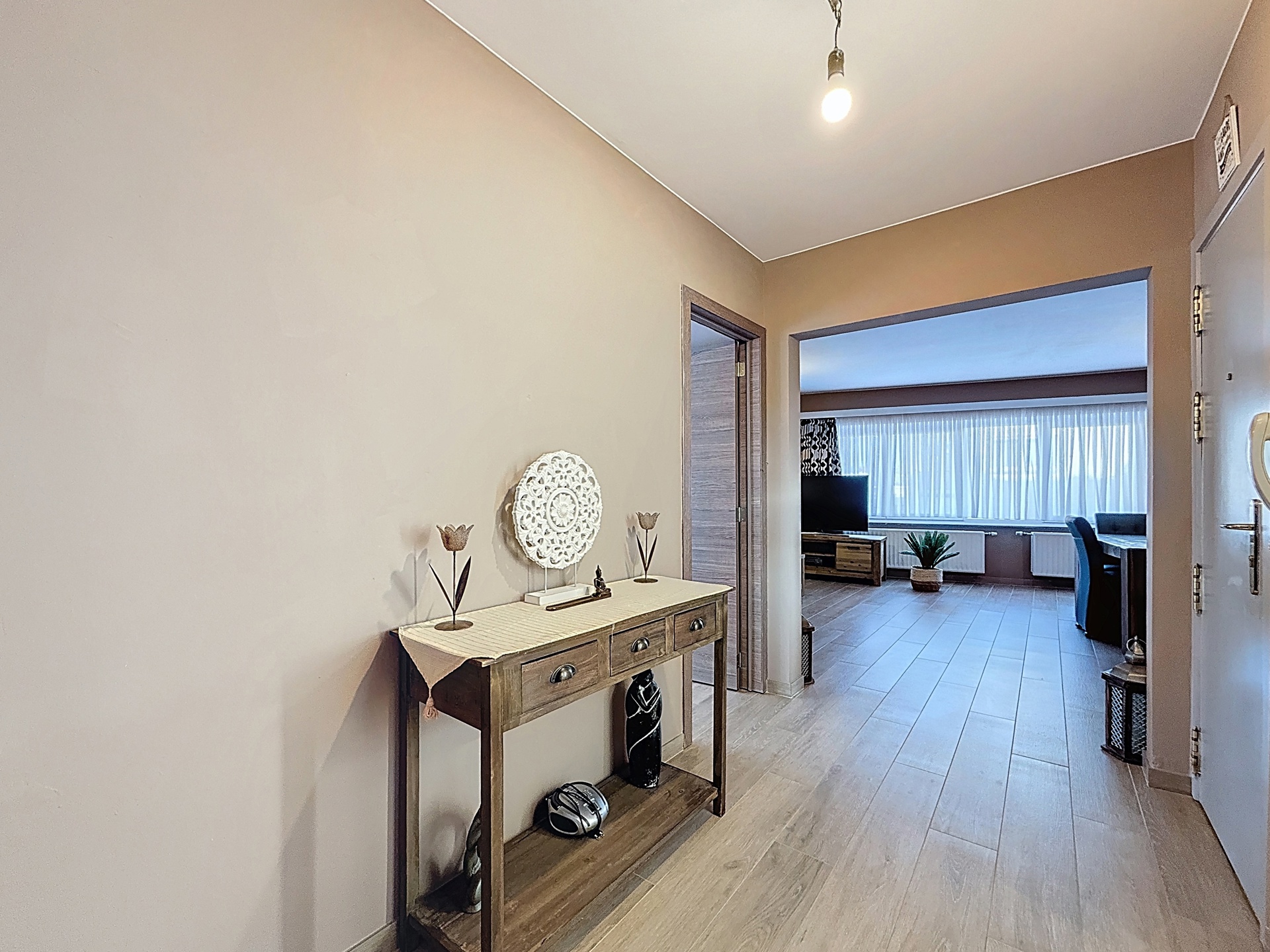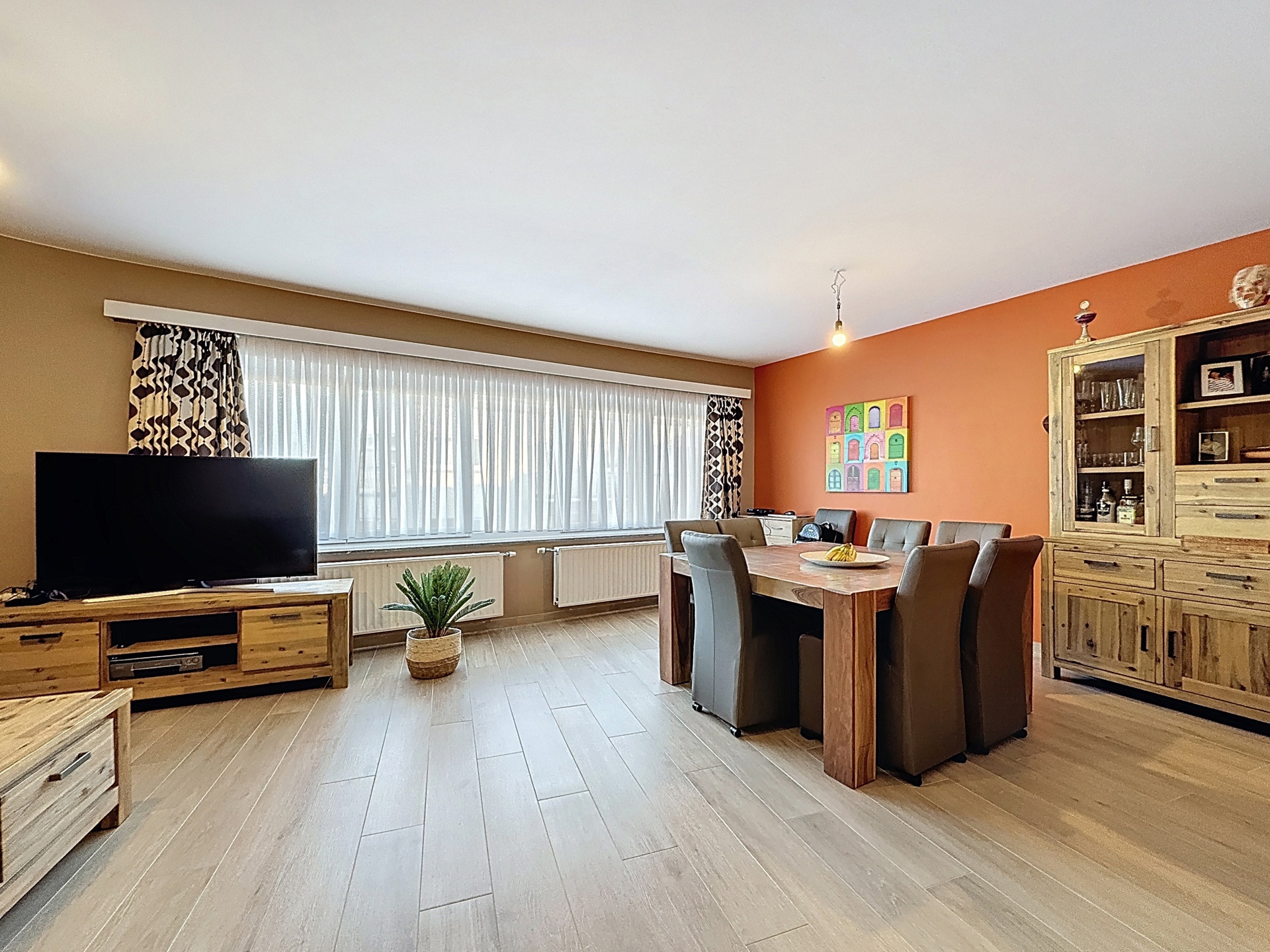 Celui-ci se compose de: un hall d'entrée, un living de +-34m2, une cuisine super-équipée, deux chambres de +-12,3m2 et +-8m2, une salle de douche avec WC. Ce bien dispose d'une terrasse fermée aménagée en buanderie