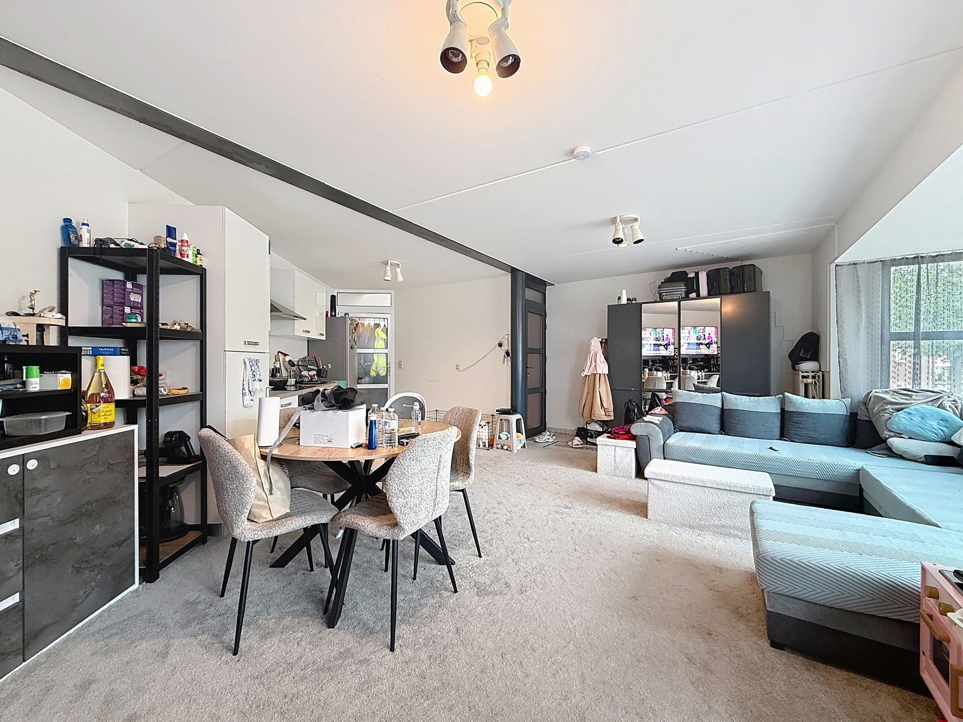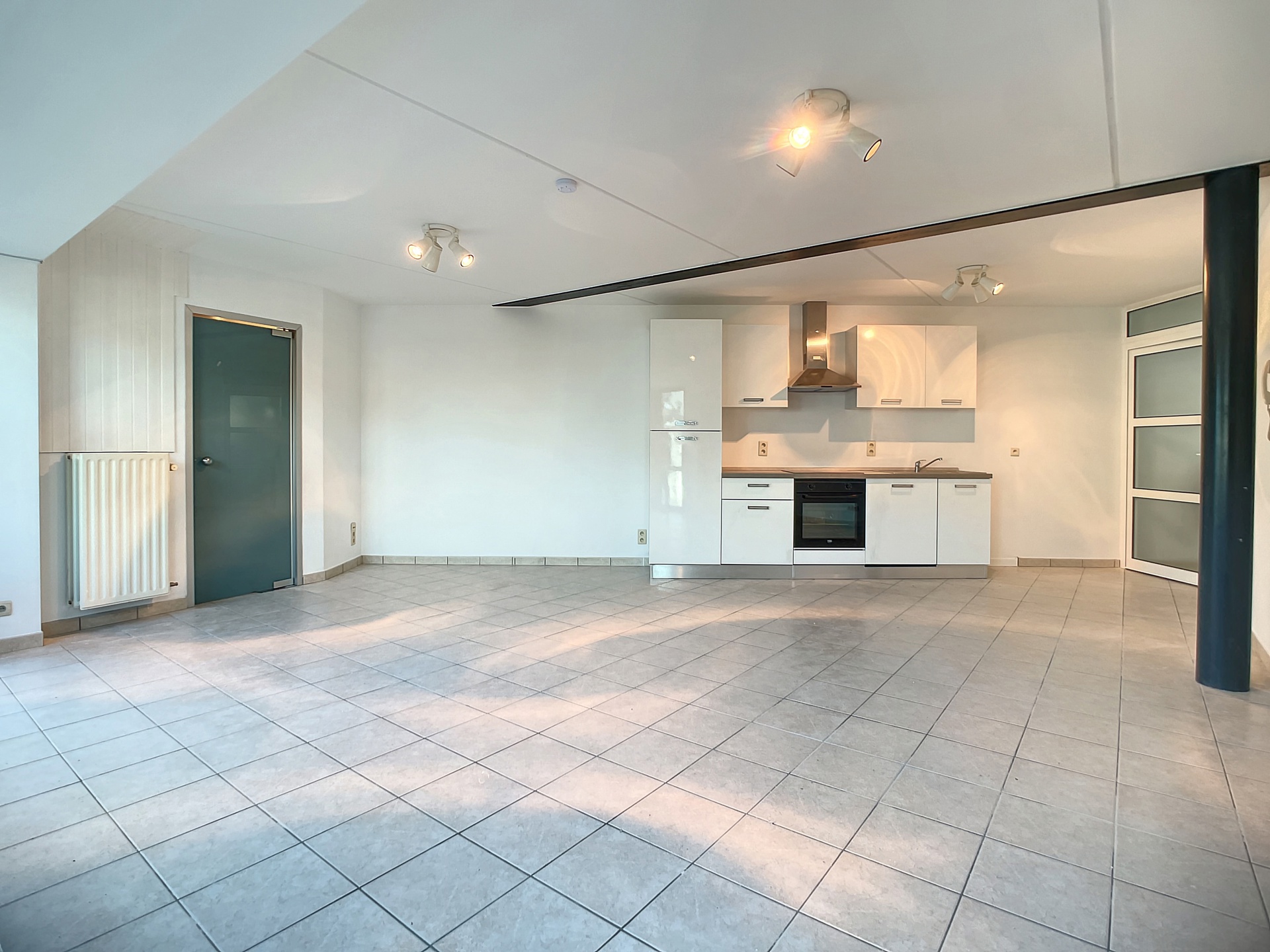 Celui-ci se compose de : un hall d'entrée, une salle de séjour de +-30m2 avec cuisine ouverte semi-équipée ainsi qu'une salle de douche de +-4m2 avec WC.