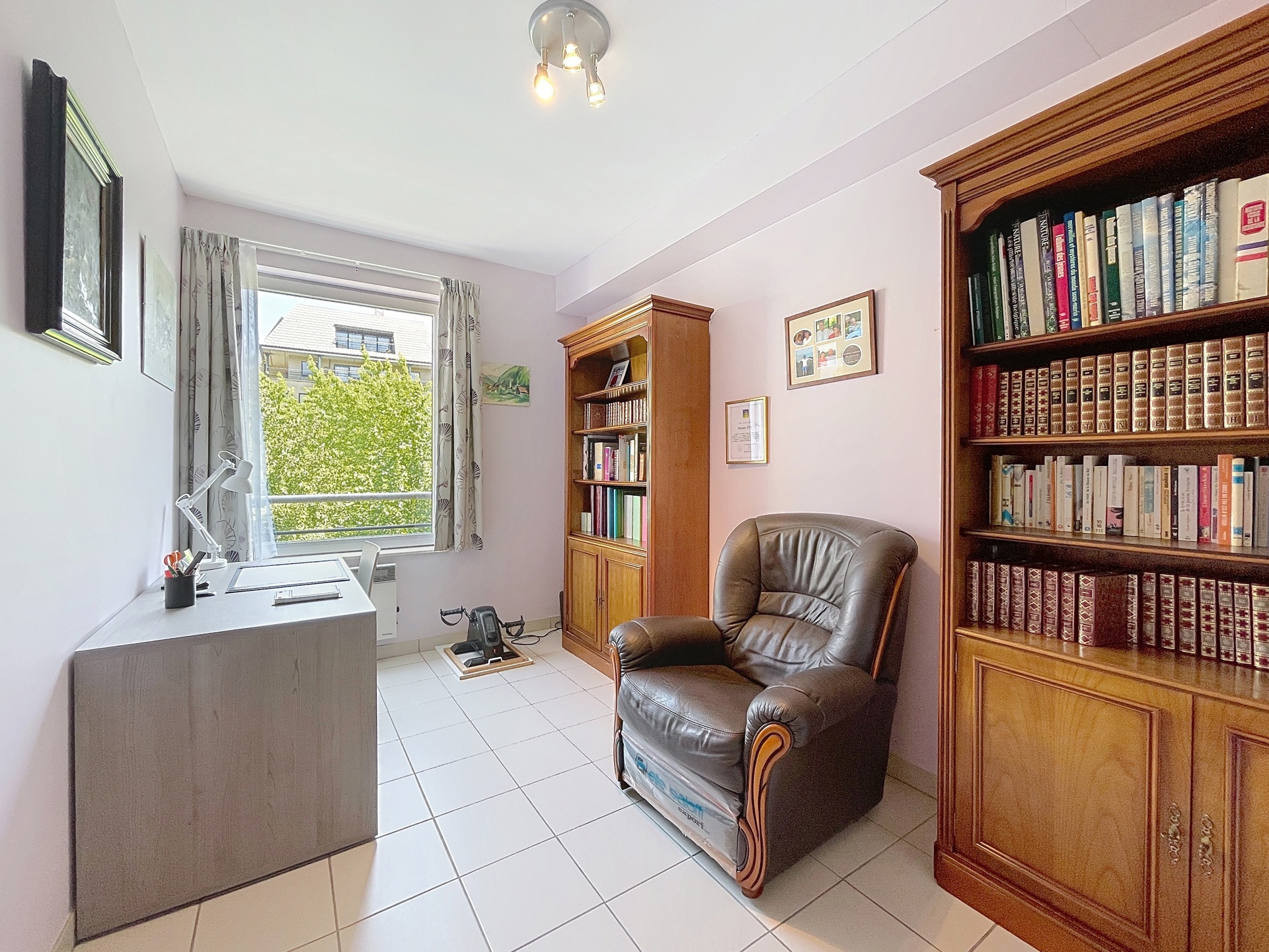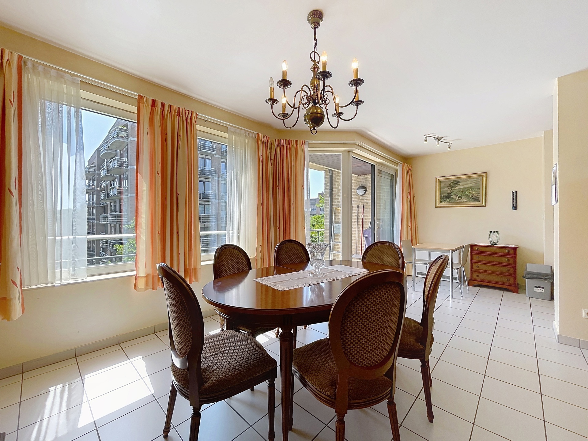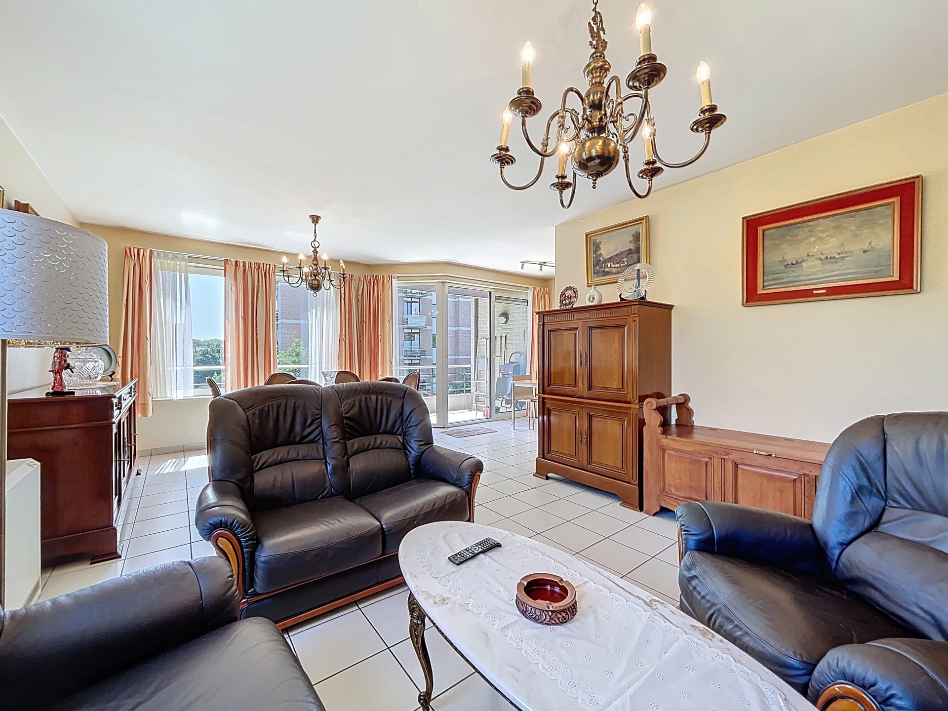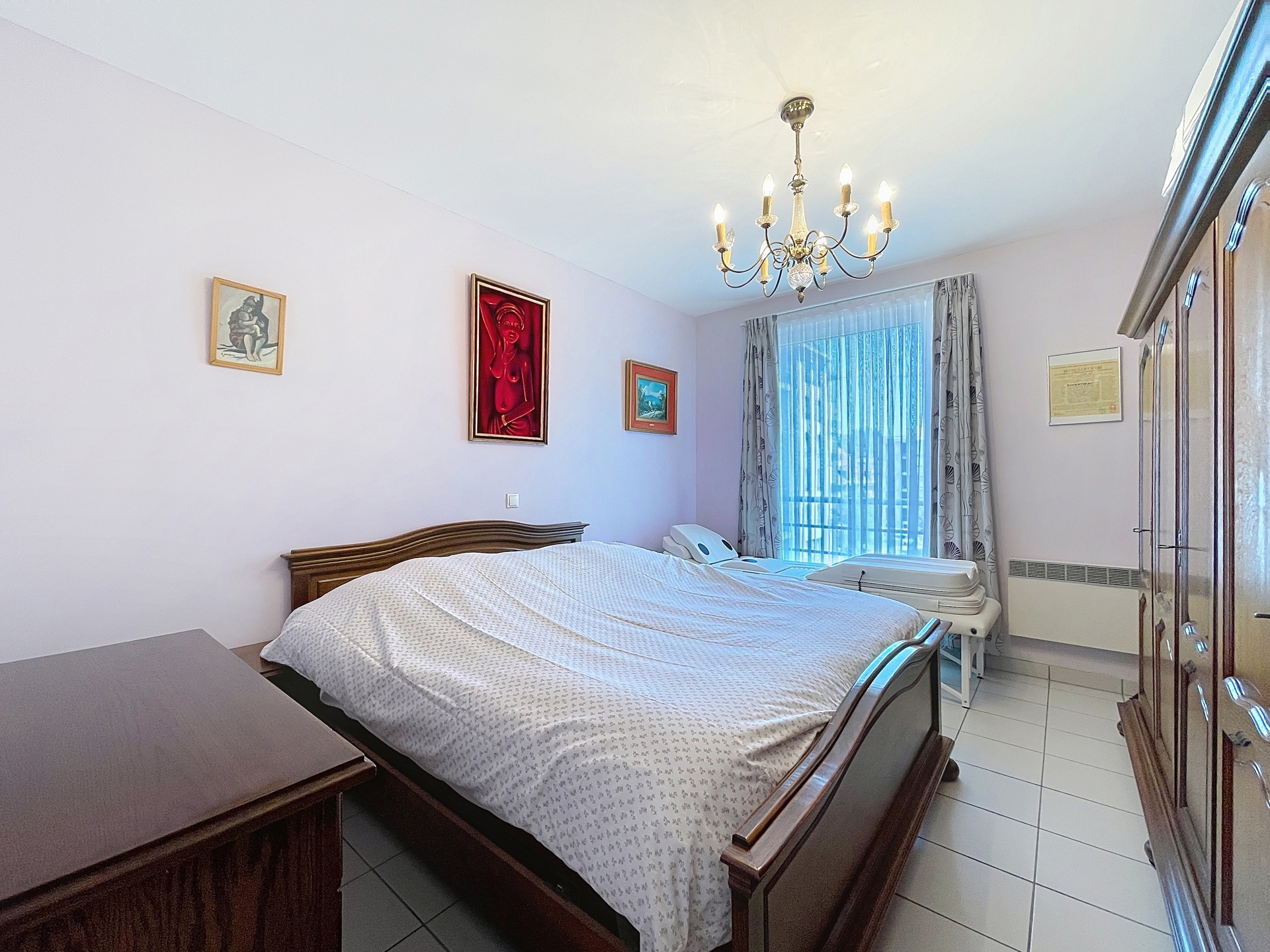 Deze flat bestaat uit: een grote hal, een woonkamer van +-35m2 met een open keuken van +-5,5m2, een kamer van +-14m2 met eigen doucheruimte en toilet van +-5,5m2 en twee andere kamers van +-9,5m2.