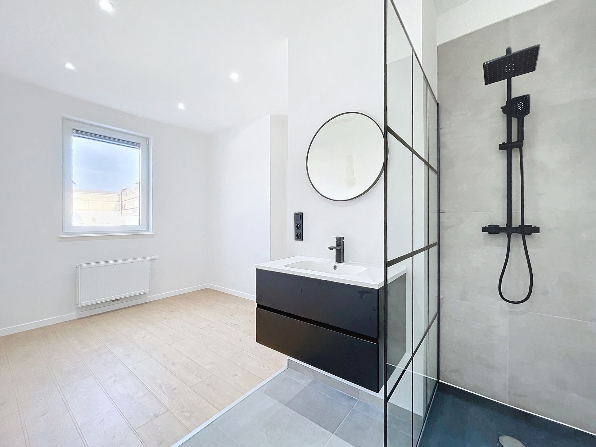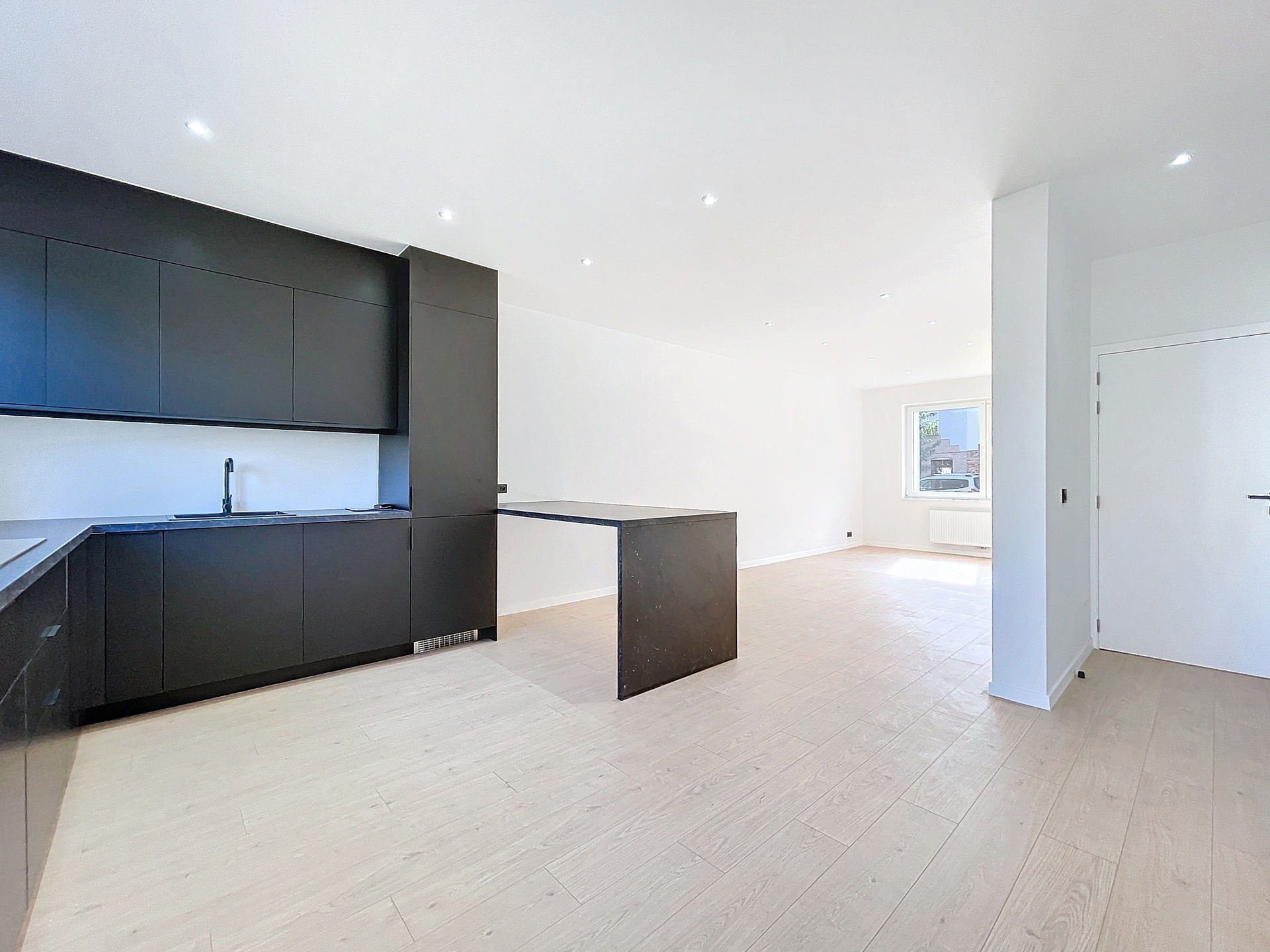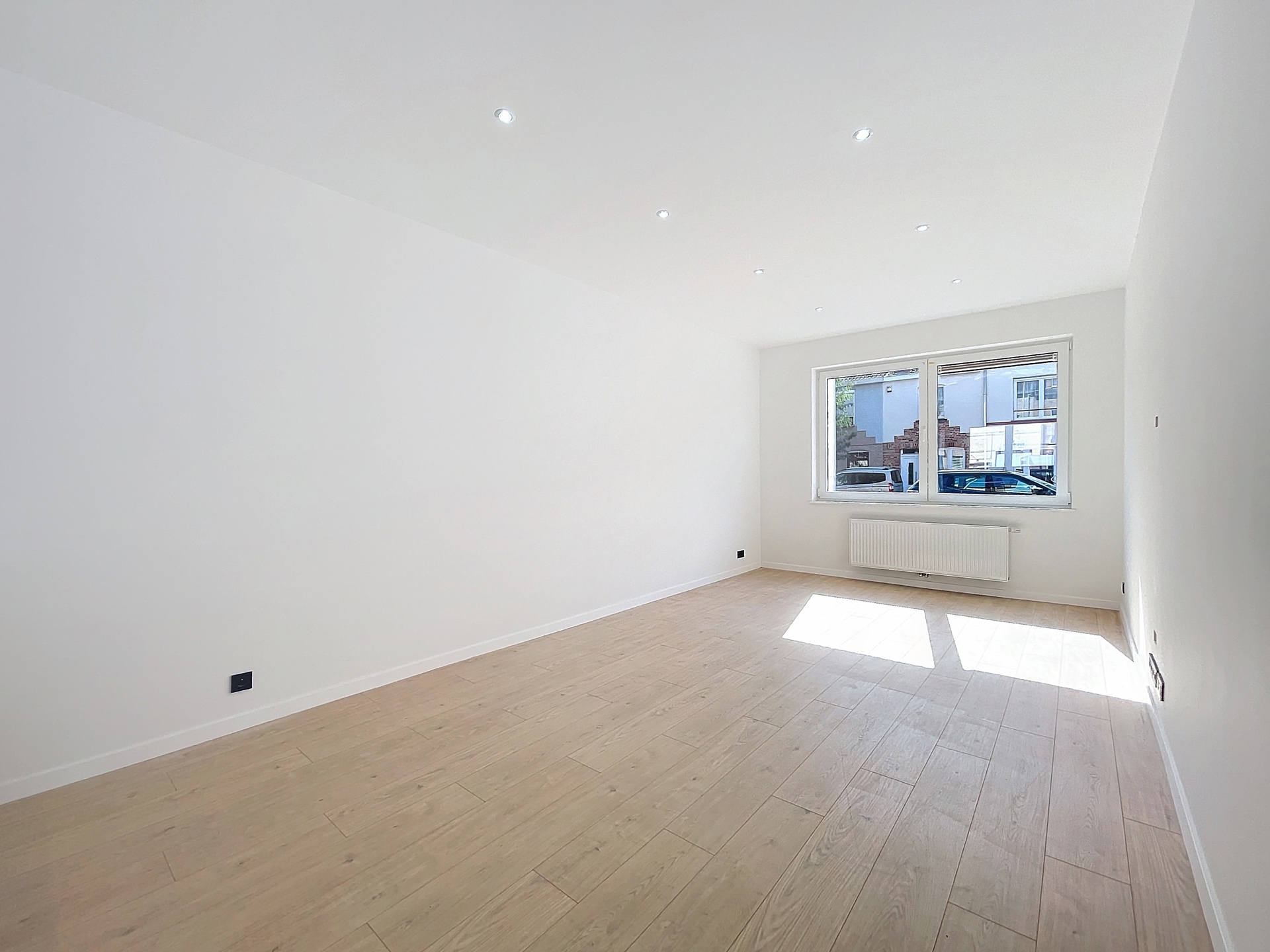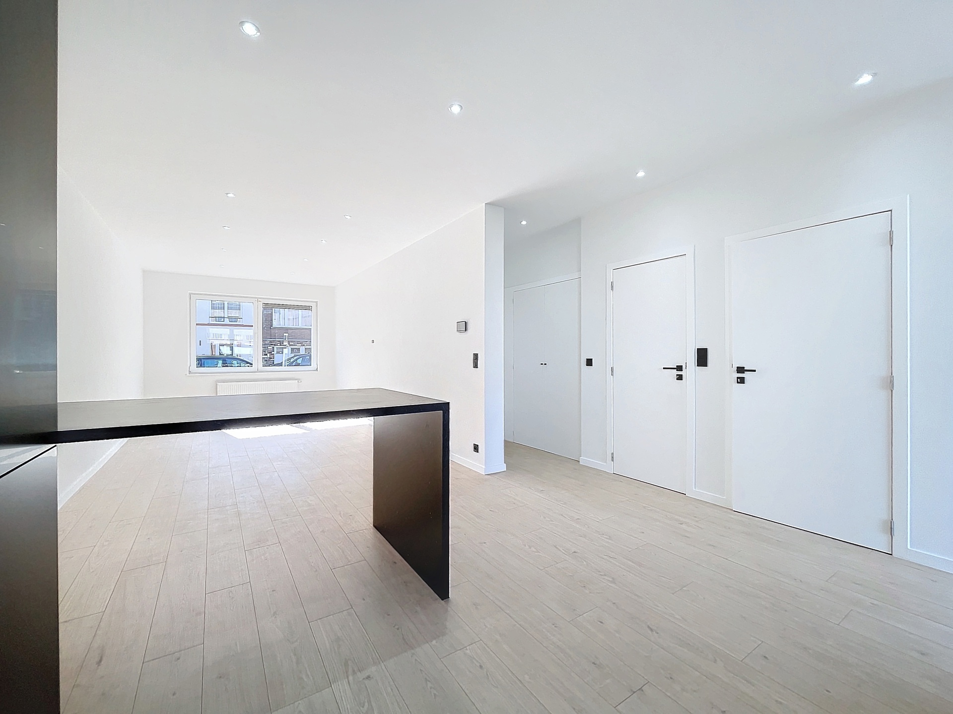 Gelegen op het gelijkvloers van een kleine mede-eigendom, bieden wij te koop aan deze prachtige, volledig gerenoveerde flat met +-56m2 bewoonbare oppervlakte.